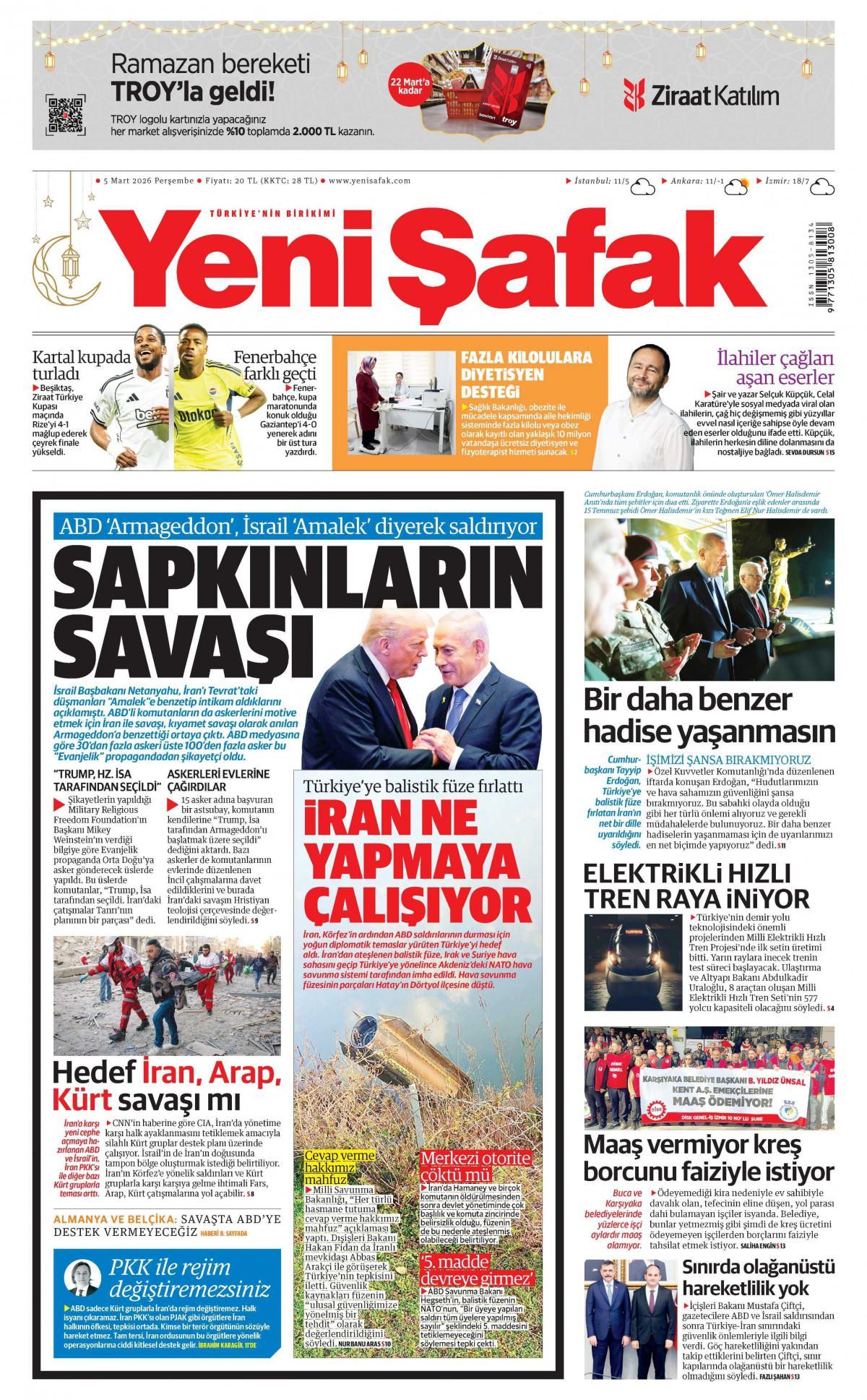 Yeni Şafak Gazetesi 5 Mart 2026, Perşembe Günü Manşeti